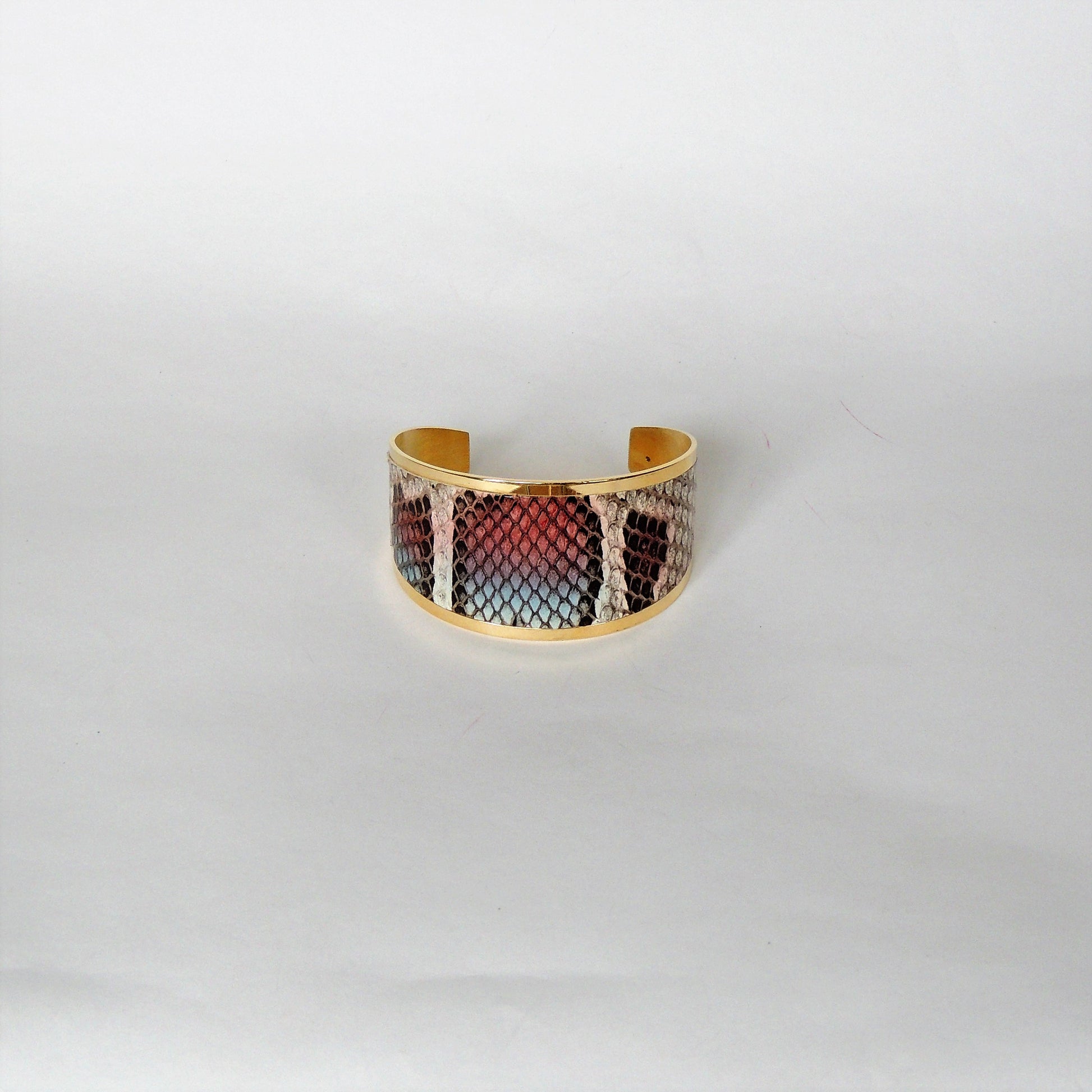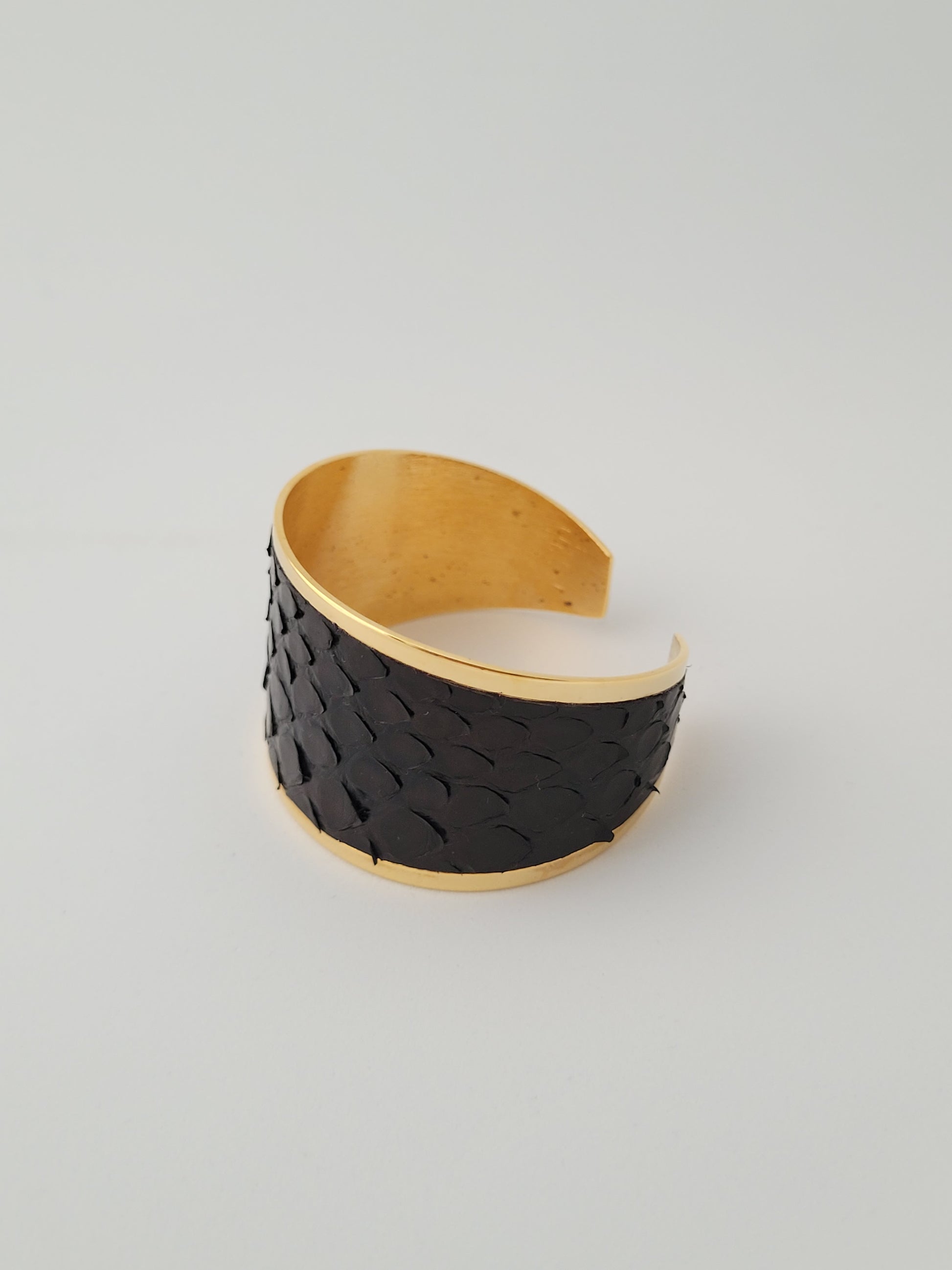 Brazalete rígido de latón bañado en oro con acabado en piel de serpiente pitón natural.