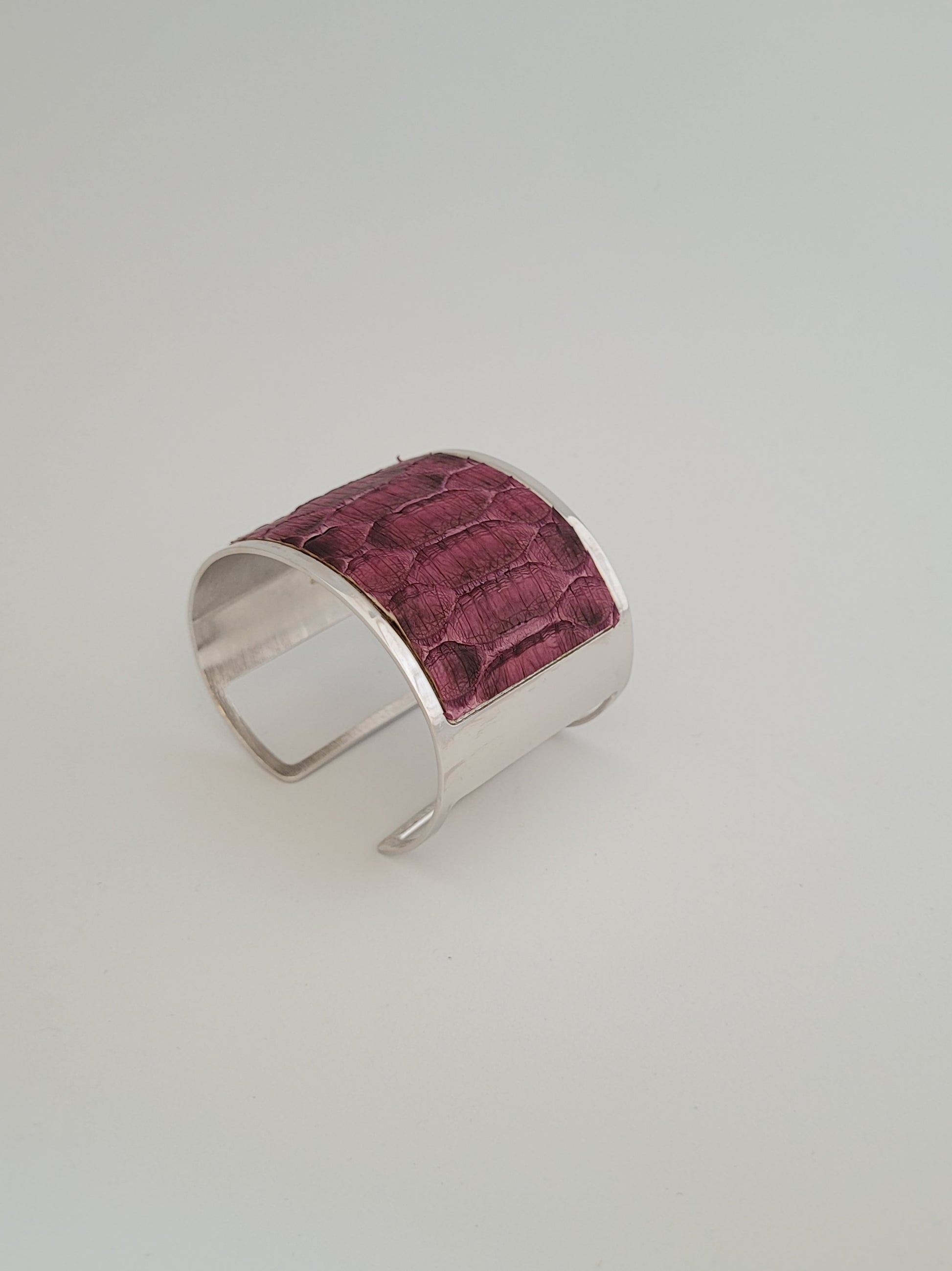 Brazalete rígido de latón bañado en rodio con acabado en piel de pitón natural.