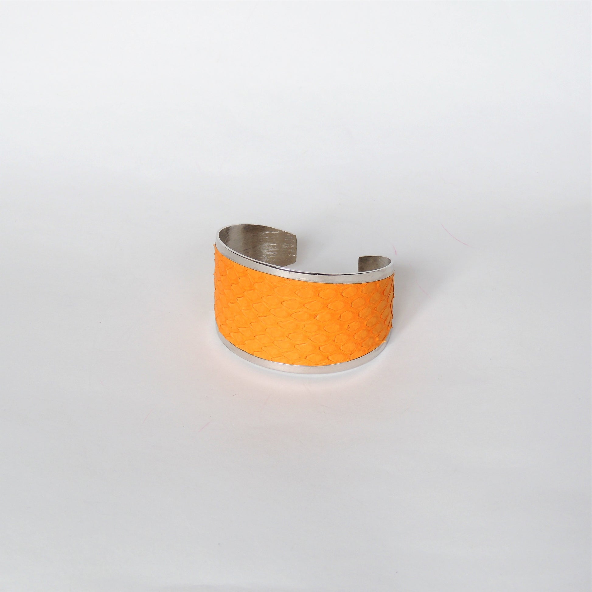 Brazalete rígido de latón bañado en rodio con acabado en piel de serpiente pitón natural.